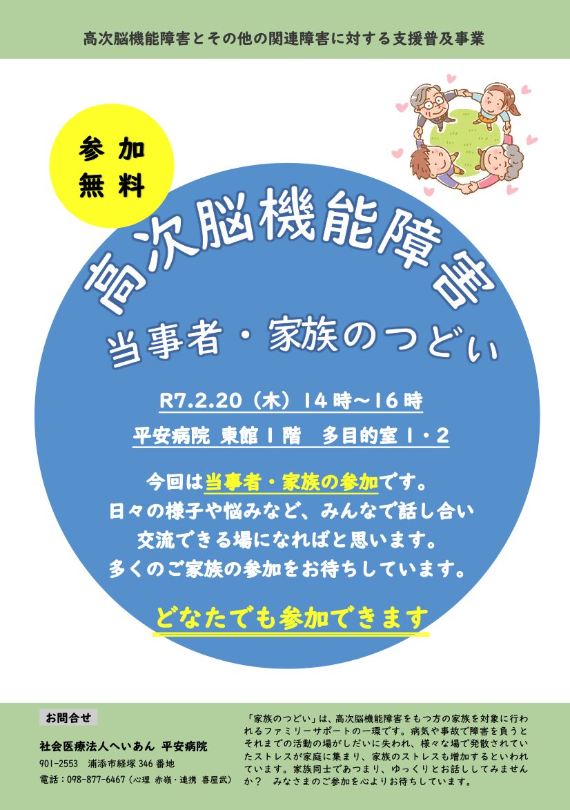 「家族のつどい」は、高次脳機能障害をもつ方の家族を対象に行われるファミリーサポートの一環です。病気や事故で障害を負うとそれまでの活動の場がしだいに失われ、様々な場で発散されていたストレスが家庭に集まり、家族のストレスも増加するといわれています。家族同士であつまり、ゆっくりとお話ししてみませんか? みなさまのご参加を心よりお待ちしています。